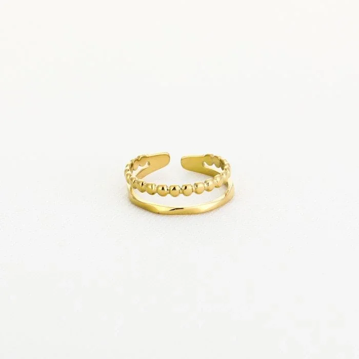 Maak je look compleet met de Shiny Beads ring — een stijlvolle goudkleurige dubbele ring met een verfijnde combinatie van een gladde band en een band met kleine bolletjes. Het minimalistische maar elegante ontwerp maakt deze ring perfect voor zowel dagelijks gebruik als speciale gelegenheden.