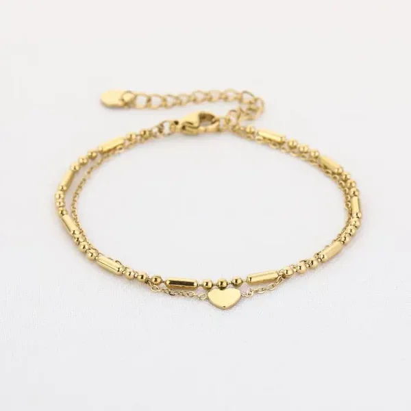 Deze dubbele hartjes armband combineert elegantie met een speels detail. De armband bestaat uit twee verfijnde kettingen: één met subtiele kraaltjes en staafdetails en één gladde schakelketting, afgewerkt met een glanzend hartvormig bedeltje. Verkrijgbaar in zowel goudkleurig als zilverkleurig, waardoor de armband moeiteloos past bij elke stijl.