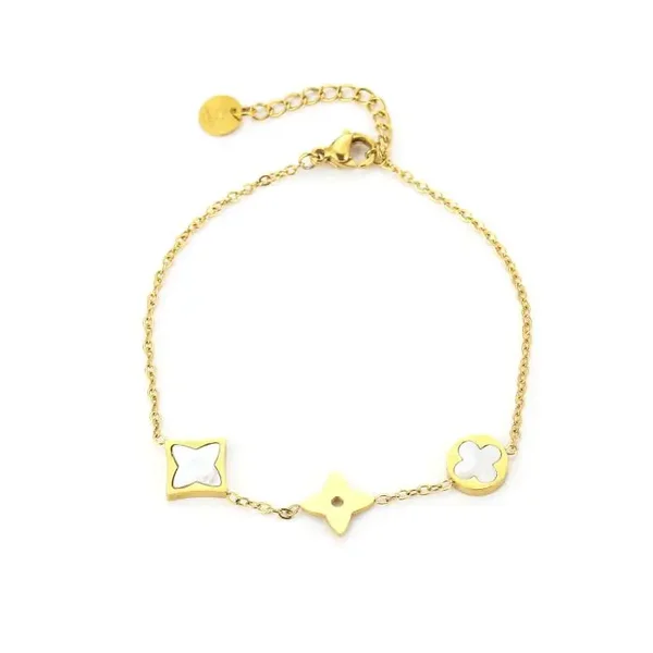 Deze elegante armband vormt de perfecte match met de bijpassende oorhangers en straalt dezelfde verfijnde, moderne stijl uit. Het subtiele klaverdesign in combinatie met fijne schakels zorgt voor een speelse maar luxe uitstraling. De armband valt soepel om de pols en is ideaal om zowel los te dragen als te combineren met andere sieraden voor een gelaagde look.