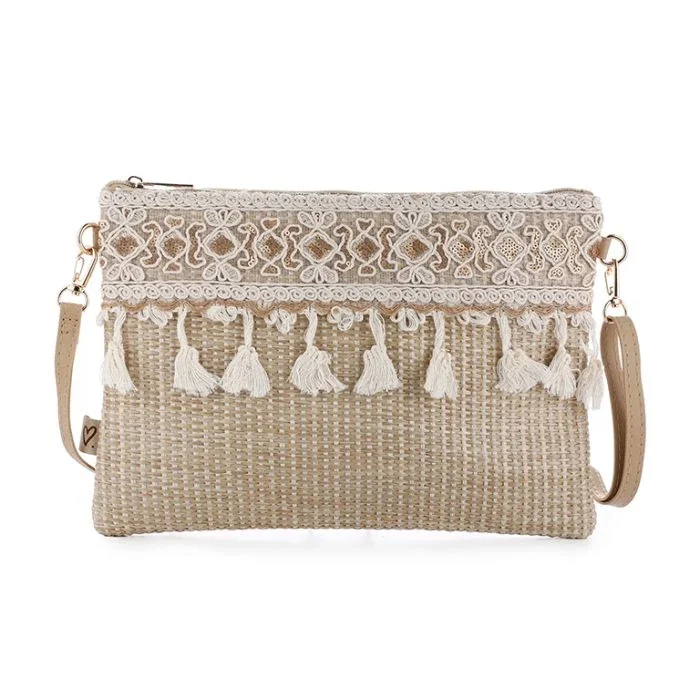 De Nomad Tassel Crossbody Bag is de perfecte boho accessoire voor een zomerse, natuurlijke look. Deze stijlvolle tas is uitgevoerd in een geweven strolook en afgewerkt met sierlijk kant en speelse kwastjes, wat zorgt voor een echte Ibiza / bohemian vibe. Dankzij het ruime formaat van 28 x 20 cm biedt de tas voldoende plek voor je dagelijkse essentials.